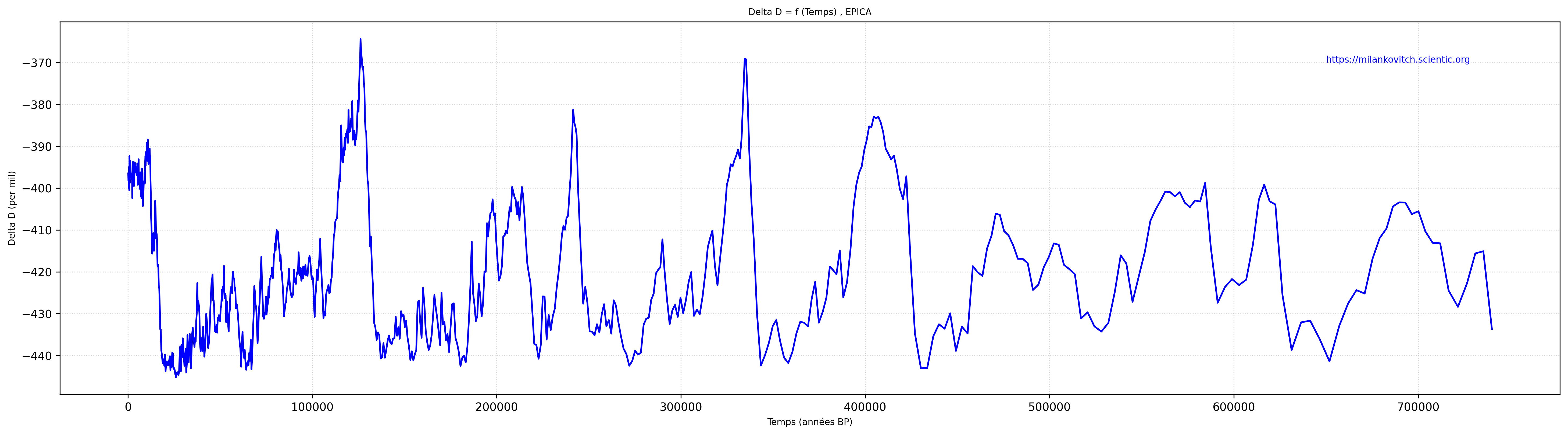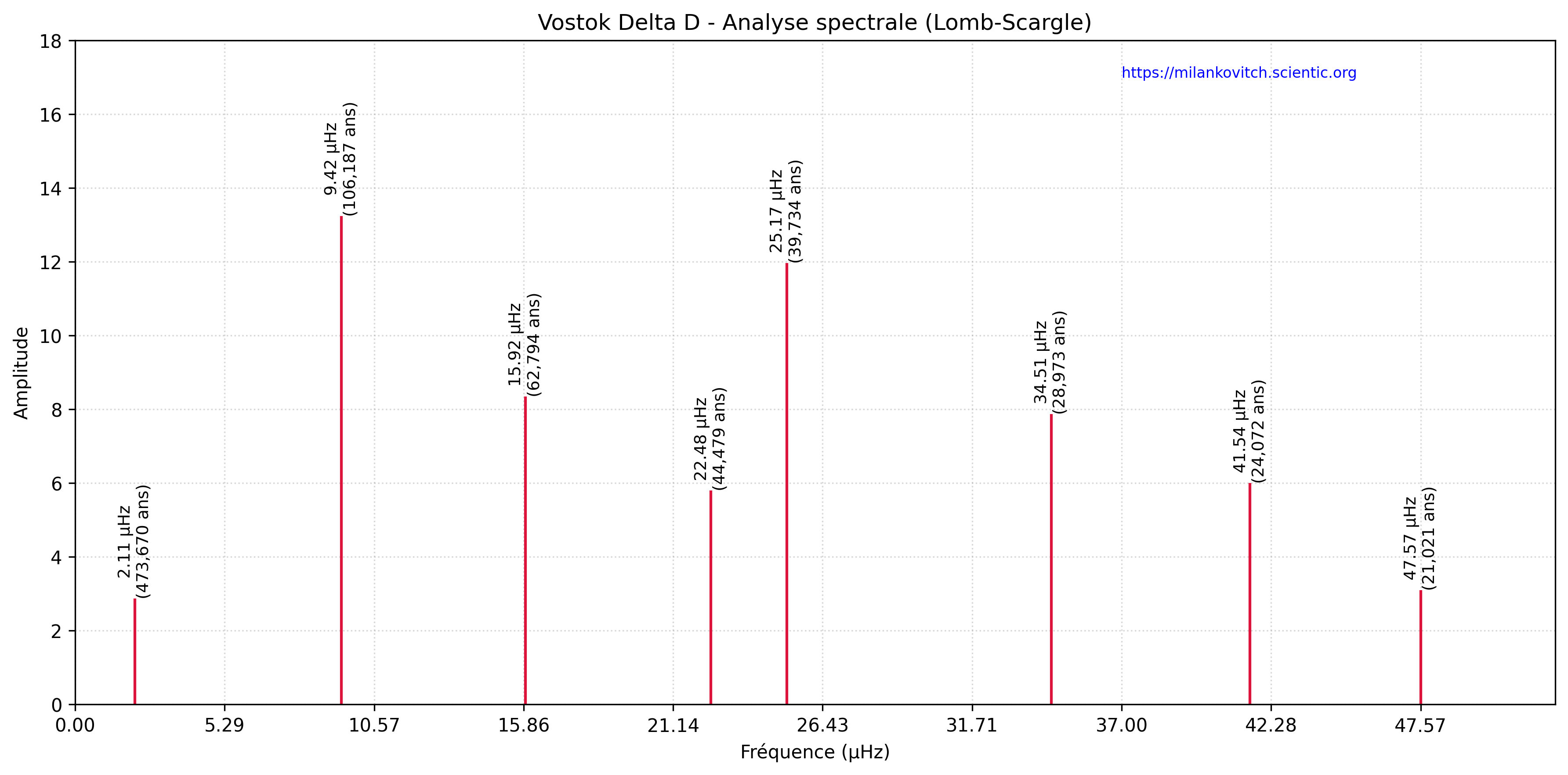 L’analyse spectrale montre que cette alternance de périodes "froides" qualifiées de périodes glaciaires, et de période "chaudes" qualifiées de périodes interglaciaires, présente les périodicités approximatives suivantes: 400 000 ans, 100 000 ans , 40 000 ans , 23 000 ans.